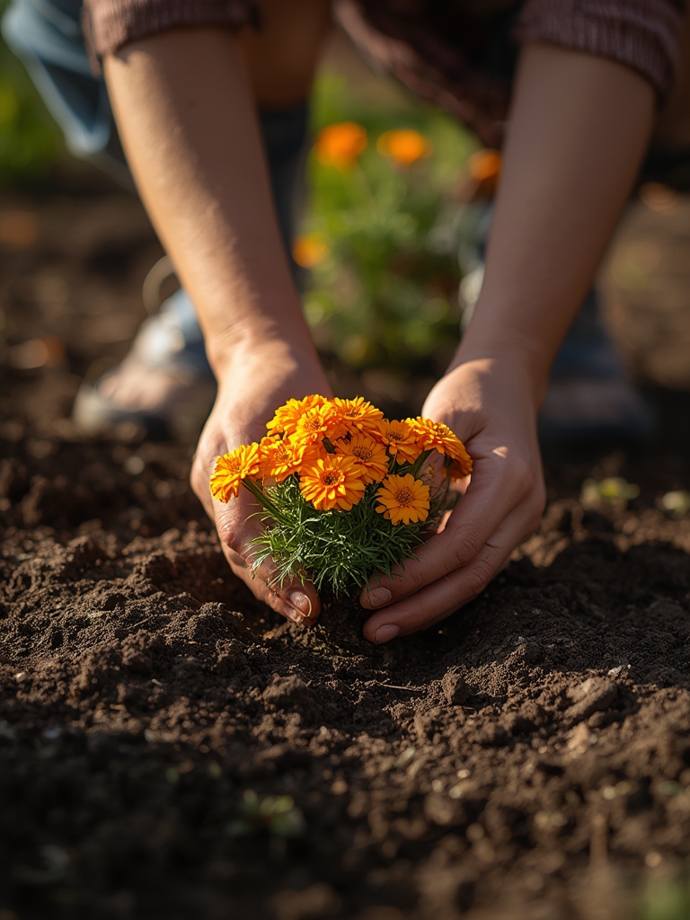 3. Transplant or direct sow: Space plants 8-12 inches apart depending on variety, with taller African marigolds needing more room than compact French varieties.